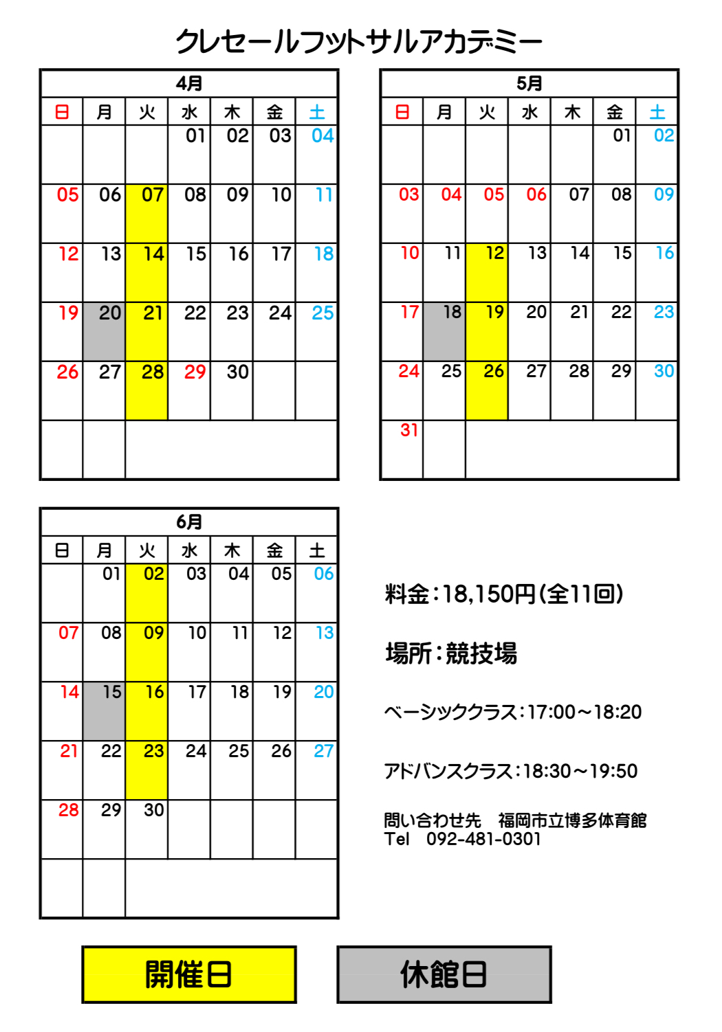 この度、博多体育館にてクレセールフットサルアカデミーを開校します。 毎週火曜日 ベーシッククラス(初心者向け)17時〜18時20分 アドバンスクラス(中級、上級者向け)18時30分〜19時50分 料金は3ヶ月で18150円(1ヶ月6050円) 体育館受付にてお支払い下さい。 随時無料体験できますので、希望者は体育館までお問い合わせ下さい。 TEL 092-481-0301